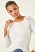 Scalloped Neck Knit Jumper from Roman. Indulge in feminine elegance with this scallop lace knit jumper, perfect for Autumn/Winter. The delicate scallop neckline and lace sleeves add a touch of romance, while the hardwear buttons on the cuffs bring a modern twist. The long sleeves provide extra warmth, making it a cosy yet stylish choice. Pair with a chic pencil skirt and boots for a sophisticated look that's ideal for the colder months.