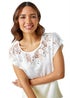 Sparkle Palm Print Cut Out T-Shirt from Roman. Basic t-shirts are a wardrobe necessity and this piece has an interesting edge with its burnout palm print yoke and sparkling embellishment. Cut from a relaxed, jersey fabric, this piece features a modest round neckline and short sleeves. Designed to pull on overhead this top is perfect with cropped stretch trousers and sandals for an effortless Summer look!