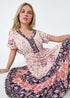 Petite Floral Border Print Midi Dress from Roman. Give a nod to the boho trend with this pretty, Petite, printed dress. It is adorned in a seasonal floral paisley pattern with a contrasting border print hemline. Cut from a smooth woven fabric this dress features a feminine v neckline, finished with sweet button detail and simple short sleeves. An elastciated waist is completed with added tie detail for a secure and flattering fit. The skirt falls in soft pleats in a fit and flare style to a modest midi length. Pair with heeled wedges and a denim jacket for effortless Summer style!