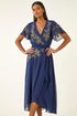 Roman Midnight Blue Premium Beaded Wrap Midi Dress