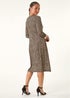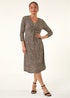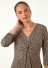Petite Abstract Twist Front Dress from Roman. Get ready to make a statement in this abstract twist midi dress. The dress features a flattering v-neck and elegant 3/4 sleeves with elasticated cuffs that add a touch of style. Designed in a fit and flare shape, this dress complements your figure beautifully. Pair it with tights and ankle boots for a chic and sophisticated look that's perfect for the Autumn and Winter seasons!