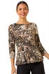 Animal Print Peplum Stretch Top from Roman. Unleash your wild side with this striking animal print jersey top. The top features a flattering peplum shape, 3/4 sleeves, and a classic round neck. Cut to hip length, this top is versatile for any occasion. Pair it effortlessly with jeggings and ankle boots for a chic and stylish look that will turn heads this season!