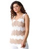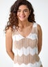 Chevron Stripe Knit Top from Roman. Elevate your summer style with this stunning knitted Vest. Crafted from a luxurious stretch knit fabric, this sleeveless vest is perfect for those warm summer days. The captivating chevron print paired with shimmering metallic thread add a touch of glamour to the playful v-neck and v-back silhouette. Easy to slip on, this vest pairs effortlessly with the matching cardigan and shorts for a chic and cutesy daytime ensemble.