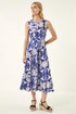 Abstract Print Midi Dress from Roman. Stand out in style with this chic abstract print midi. This round neck sleeveless dress features a flattering fit and flare shape, perfect for any Spring/Summer occasion. The eye-catching abstract print adds a touch of fun and personality to your look. Just pair it with sandals and a denim jacket for an effortlessly stylish ensemble that's sure to turn heads!