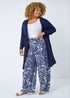 Curve Linear Print Palazzo Trousers from Roman. Add some bold prints to your separates collection with these curve, linear print palazzo trousers. Cut from a stretch, jersey fabric these trousers are designed in a palazzo style with wide legs and a comfortable elasticated waist band. Designed to pull on, with no tricky fastenings these trousers are adorned in an oversized linear print. Pair with a plain bodysuit and a longline cardigan for a smart, casual look or add a blouse and heels to dress up!