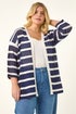 Curve Stripe Crochet Knit Cardigan from Roman. Add a touch of chic to your wardrobe with this classic Curve stripe knit cardigan. Featuring a stripe contrast crochet and cosy 3/4 sleeves, this stylish piece finishes at the hip and has a front button detail. Completed with a classic v-neckline, this cardigan is perfect to layer over your favourite shirt and jeggings for a casual yet sophisticated look!