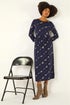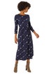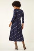 Floral Gathered Waist Midi Dress from Roman. Make a stylish statement this Autumn/Winter in this pretty floral round neck midi dress. Designed with 3/4 sleeves and crafted from a soft, stretchy jersey fabric, this dress offers both comfort and style. The flattering gathers at the waist create a chic silhouette while side pockets add a practical touch. Pair with tights and ankle boots for a versatile and on-trend look that will take you from day to night effortlessly!