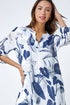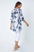 Palm Print V-Neck Wrap Hem Tunic Top from Roman. Pretty palm prints are key for the warmer months and this light weight, wrap hem shirt showcases them beautifully. Cut from a printed, woven fabric this piece features a feminine v neckline and fun 3/4 length sleeves. Designed in an oversized, longline tunic style this is both comfortable and stylish. Add cropped jeggings and sandals for a fuss free but fashionable look!