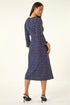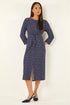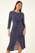 Petite Spot Front Knot Dress from Roman. Get ready to radiate effortless style in this spot knot dress, perfect for the Spring/Summer season. The round neck and 3/4 set in sleeves provide a classic touch, while the comfortable printed stretch fabric ensures all-day comfort. Featuring a split up the centre front and a chic midi length, this pull-on style dress is versatile and easy to wear. Complete the look with a denim jacket and trainers for a casual and trendy ensemble.