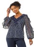 Petite Spot Print Frill Top from Roman. Set the trend this Autumn/Winter with the spot frill top. This versatile woven top features a stylish V-neck with delicate frill detailing, perfect for adding a touch of elegance to your look. The comfortable pull-on style makes it easy to wear, while the long set-in sleeves with frill accents add a chic finishing touch. Pair with jeggings and ankle boots for an effortlessly stylish ensemble that can take you from day to night with ease!