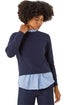 Stripe Shirt Underlay Knit Jumper from Roman. Designed as a one-size piece, it offers an oversized fit for a size 10/12 while providing a more true to size fit for a size 14/16. Embrace effortless style with this chic shirt knit jumper. The perfect Autumn/Winter piece, it features a classic stripe shirt underlay coupled with a soft knit fabric and cosy long sleeves. Pair with jeggings and ankle boots for a timeless look that's both comfortable and stylish!
