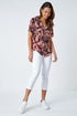 Leaf Print Zip Detail V-Neck Stretch Top from Roman. Go from desk to dinner with this striking leaf print top! Designed with a simple v-neck, short sleeves and zip front, this stretch jersey top is the perfect choice for a comfortable yet stylish fit. This pull on style is adorned in a leaf print with a ditsy spot design. Suitable for a day at work or an evening dinner with friends, this tee is perfect for any occasion.