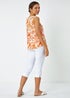 Sleeveless V-Neck Floral Print Vest from Roman. An abstract floral print in a bright on trend colour adorn this cool, sleeveless vest top. Cut from a smooth, woven fabric this piece features a feminine v neckline and delicate ladder lace detail. Designed to pull on overhead this piece is perfect paired with cropped stretch trousers and sandals!