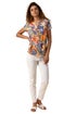 Tropical Print Tie Front V-Neck Stretch Top from Roman. Prepare for Summer with this tropical print burnout t-shirt. Featuring short sleeves, notch neck and an on-trend tie front detail, this will be sure to become a new season staple. This comfortable jersey stretch material is perfect for casual day to day wear whether it be for holidays, cruises or just everyday wear!