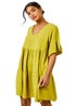 Textured Tiered Smock Dress from Roman. This beautiful textured smock dress is crafted from a light and airy summer fabric with a flattering tiered shape. Featuring a v-neckline, short frill sleeves and a floaty silhouette, this dress is perfect at home or on holiday paired with strappy sandals. A vibrant summer colour that is both effortless and a key staple, this airy smock dress is the perfect poolside cover up.