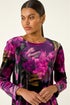Floral Velvet Chiffon Top from Roman. Add a touch of opulence to your Autumn/Winter wardrobe with this stunning velvet top. Crafted from a floral velvet jersey fabric, this top features a chic contrast chiffon hem that adds a flirty touch. The long sleeves and round neckline offer a classic look, while the below hip length makes it perfect for pairing with jeans and heeled boots for a stylish ensemble.