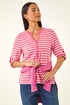 Petite Stripe V-Neck Button Top from Roman. Elevate your Spring Summer wardrobe with this stylish Petite stripe button-up top. The flattering v-neckline and charming front button details add a smart look, while the 3/4 length sleeves offer a sophisticated style. Crafted from a soft cotton stretch fabric, this top features striking stripe details for a trendy look. Pair with linen trousers and sandals for an effortless outfit that's perfect for the season!
