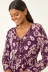 Roman Purple Floral Print Tie Front Stretch Top