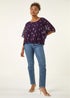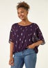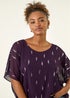 Foil Print Bubble Hem Top from Roman. Add a touch of glamour to your Autumn/Winter wardrobe with this stunning foil print bubblehem top. Designed in an overlay style with chic short sleeves and a classic round neckline, this top is perfect for both day and evening wear. The eye-catching foil print adds a touch of sparkle to any outfit, making it a versatile piece. Pair with your favourite jeans and heeled boots for a trendy and stylish look that will take you from day to night effortlessly!