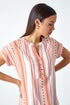 Aztec Print Button V-Neck Detail Top from Roman. Warm weather calls for flattering shapes and soft prints and this top has both! Cut from a smooth woven fabric this piece features a flattering notch neckline, finished with flattering pleats and cute button detail. Short sleeves feature stylish turn up cuffs and tab button detail at the shoulders. Adorned in an intricate Aztec print this piece will earn you some serious style points. Simply pair with light shorts and sandals for a Summer ready look!