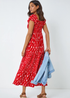 Learn moreBoho Print Tiered Maxi Dress from Roman. Be bold in bohemian prints with this feminine floral maxi dress. The floaty fit and flare shape offers a summery finish. A stretch shirred bodice creates a flattering silhouette that is easy to pull on throughout spring summer. This dress features a sweetheart neck with tie detail, elasticated short sleeves and a airy tiered skirt. Whether on holiday or attending a barbeque garden party, team this maxi with a denim jacket and sandals for a sunny day.