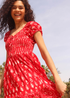 Boho Print Tiered Maxi Dress from Roman. Be bold in bohemian prints with this feminine floral maxi dress. The floaty fit and flare shape offers a summery finish. A stretch shirred bodice creates a flattering silhouette that is easy to pull on throughout spring summer. This dress features a sweetheart neck with tie detail, elasticated short sleeves and a airy tiered skirt. Whether on holiday or attending a barbeque garden party, team this maxi with a denim jacket and sandals for a sunny day.