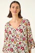 Floral Print Flare Sleeve Top from Roman. Set the style stakes high with this trendy floral tee. Crafted from a comfortable woven fabric, this sophisticated top showcases a stunning blooming floral print. Designed with a chic v-neck and fashionable 3/4 flare sleeves, this tee is a perfect balance of style and comfort. With its classic tee shape, you can easily style it with a denim jacket and wedged heels for the ultimate Spring Summer look!