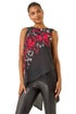 Floral Wrap Embellished Top from Roman. Elevate your Autumn/Winter wardrobe with this stunning floral wrap top. Adorned with a beautiful floral placement print, this sleeveless top features a classic round neck and flattering wrap style. The high-low hem design adds a modern touch to this feminine piece. Perfect for pairing with jeans and ankle boots for a chic and stylish look that transitions seamlessly from day to night!