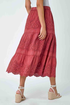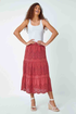 Broderie Elastic Waist A Line Tiered Midi Skirt from Roman. Broderie fabrics let you know that Summer is upon is and this skirt is no exception! Cut and fully lined with a cooling cotton fabric, this midi skirt features intricate broderie detailing in an ornate, boho-inspired print. Designed in a tiered silhouette, this floaty skirt is the ideal piece for the warmer weather. Pair with sandals and a cami for a stylish seaside style!