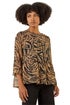 Animal Print Tiered Top from Roman. Bring out your wild side with this animal tiered top perfect for Autumn/Winter. Featuring a striking all-over zebra print, this top boasts a classic round neckline and trendy 3/4 sleeves. The gathering at the tiers adds a touch of flair and movement to this fun piece. Pair with jeggings and ankle boots for a stylish look that's both comfortable and chic!