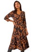 Leaf Print Wrap Midi Dress from Roman. Update your Autumn/Winter wardrobe with this stunning leaf print midi dress. The wrap bodice with a flattering V-neckline creates an elegant silhouette, while the 3/4 sleeves add a touch of sophistication. Cut in a fit and flare shape from comfortable stretch jersey, this dress offers both style and comfort. Complete the look with tights and heeled boots for a chic ensemble that will take you from day to night effortlessly.