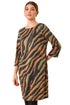 Zebra Print Stretch Swing Dress from Roman. Embrace your wild side in this zebra print swing dress. Keep cosy with the classic round neckline and long sleeves, while the smooth stretch fabric ensures comfort. With a striking animal print and essential side pockets, this knee-length dress is a must-have for Autumn Winter. Complete the look with tights and ankle boots for ultimate style!