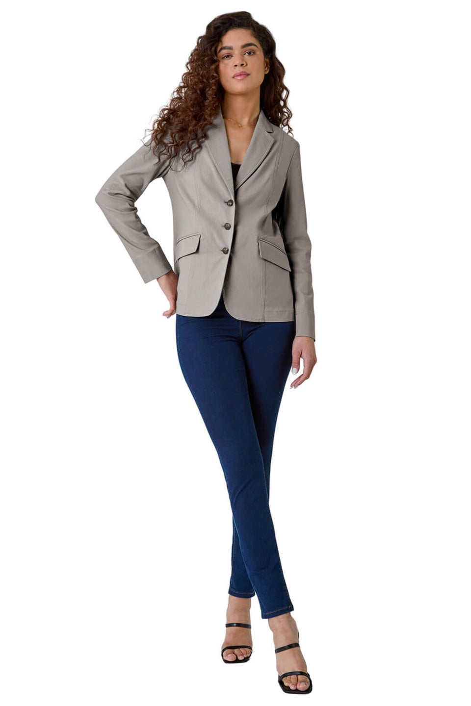Button Detail Stretch Blazer from Roman. Crafted from our favourite stretch, bengaline fabric, this smart blazer is a must have staple that will see you through all seasons in style. It features full length sleeves and a feminine v neckline when fastened. Button detail adds an extra special touch, while the revere collar ensures a smart and sophisticated feel throughout. Wear to work with our matching stretch trousers or pair with a bodysuit and jeans for a more casual, off duty look!