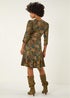 Floral Print V-Neck Stretch Dress from Roman. Brighten up your Autumn Winter wardrobe with this blooming floral knee-length dress. Featuring a feminine v-neckline with front buttons, and 3/4 sleeves, this dress is cut from a comfortable stretch fabric. The dress finishes with a flirty frill hem, perfect for adding a touch of fun to your outfit. Style with a denim jacket and ankle boots for a stunning fall look!