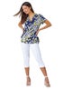 Floral Puff Print V-Neck Pleat Front Top from Roman. Add a pop of colour to your casual collection with this textured, floral print top. Cut from a comfortable stretch jersey fabric, this top features a notch neckline and simple short sleeves. A partially open front is finished with sweet button fastenings, while a single pleat ensures a flattering and relaxed fit throughout. Pair with cropped denim jeans and sandals for effortless Summer style!