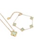 Each piece is plated in radiant yellow gold, creating a luxurious backdrop for the rich green tones of genuine jade crystals. The necklace features a single clover pendant, symbolising luck and balance, while the bracelet showcases four clover charms, each embedded with jade to create a harmonious and eye-catching design.
