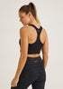Learn moreSweat it out in this black racer back sports bra by Souluxe, crafted from stretchy fabric with removable padded cups. A great base layer option, it's made from antibacterial, sweat-wicking fabric that'll help you stay cool and comfortable during your workout. Model Height: 5ft 9.