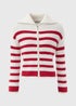 Learn moreStay snug and stylish this season with our stripe zip knitted cardigan, crafted from a soft knitted material, this cardigan provides you with unbeatable comfort and warmth. This classic zip-through cardigan features a timeless red and white stripe pattern, accentuated with a flattering silhouette that's perfect for both casual and formal occasions. Pair it over a simple t-shirt and jeans for a laid-back, casual look or layer it over a dress for an added touch of warmth and sophistication.