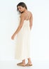 Model is 5'6 and wears a size 8. Beaded detail. Maxi Length. Cross Back. Linen Blend. Elevate your style with the timeless elegance of our new Linen Blend Beaded Maxi Dress. Perfect for special occasions and sophisticated everyday wear, this dress combines luxurious materials with exquisite detailing. Delicately adorned with intricate beadwork, adding a touch of glamour and sophistication to the dress, making it perfect for both day and evening events.