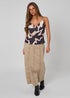 Daytime: Style with high-waisted jeans or tailored trousers, add a blazer or denim jacket, and simple flats or loafers. The drape gives polish, but the cami keeps it relaxed.