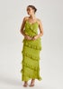 Model is 5'6 and wears a size. Ruffle design. Maxi length.Frill trims.Regular fit. The perfect holiday maxi dress featuring a flawless silhouette with a ruffle pand crew neck detail and spaghetti straps.The ideal dress for a day out with friends to a holiday centrepiece, this dress will quickly become your favourite.