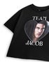 Show your allegiance to Team Jacob with the officially licensed Twilight Women's Black Cropped Short Sleeve Graphic Tee. This cropped fit t-shirt features a classic crew neck and short sleeves, making it an ideal choice for casual wear or as fan merchandise. Made from 100% cotton, it offers comfort and breathability, allowing you to showcase your fandom during any outing. On the front, the bold "TEAM JACOB" text lets everyone know where your loyalty lies in the age-old debate of Team Edward vs. Team Jacob. This piece is not only a statement of allegiance to Jacob but also a versatile addition to your wardrobe that pairs well with jeans, shorts, or skirts for a relaxed look. The plain black design offers a minimalist aesthetic, allowing for easy integration into your everyday outfits whether youre attending a Twilight movie marathon, meeting friends, or just enjoying a day out. You might recall the tension in the Cullen family baseball scene - this shirt captures that inter-character rivalry perfectly. Whether you are layering it under a jacket or wearing it solo, this cropped t-shirt serves as perfect fan apparel that connects you to the iconic Twilight saga. With its functional design, this tee also accommodates active lifestyles, making it suitable for outings or even lounging at home. If youre fond of Jacob, and you appreciate the narrative of the saga where “the lion fell in love with the lamb,” this garment is a perfect fit for expressing your admiration. This Twilight apparel is made to combine comfort and fandom seamlessly, offering a reliable accessory for all your casual occasions. The combination of its cropped style and classic fit embodies the spirit of the saga while staying true to modern trends. With this t-shirt, you can connect with fellow fans and wear your identity proudly no matter where you go.