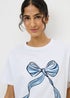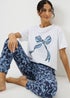 Add a touch of elegance to your night-time routine with this super sweet pyjama set. Crafted from 100% cotton, this charming set features delicate bow detailing for a subtle feminine finish. The pyjama top is cut with short sleeves and a crew neckline, meanwhile the navy printed bottoms featured cuffed hems and an elasticated waistband. The perfect pair for cosy evenings and comfortable mornings.