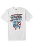 Pack this T-shirt into your holiday suitcase and get ready for a fun day out. Featuring a Captain America-inspired print to the chest, this white T-shirt can easily be partnered with shorts on hot days, as well as jeans when the weather is a bit chillier. Short sleeves and a crew neck complete the design. Model Height: 6ft 3.