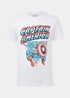 Learn morePack this T-shirt into your holiday suitcase and get ready for a fun day out. Featuring a Captain America-inspired print to the chest, this white T-shirt can easily be partnered with shorts on hot days, as well as jeans when the weather is a bit chillier. Short sleeves and a crew neck complete the design. Model Height: 6ft 3.