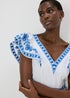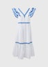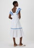 Learn moreAn elevated take on the classic white dress, this white embroidered trim midi dress is perfect for any occasion, from day to night. Cut in a flattering fit-and-flare silhouette, it features a v-neckline, short, frilled sleeves and delicate blue embroidered trims. The tiered skirt and fitted v-neckline creates the perfect flattering fit while adding the flowy skirt allows for a cool wear during the summer months. Team it with strappy heels and a clutch for a chic evening ensemble, or dress it down with sandals and a cross-body bag for a more casual daytime look.