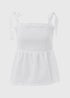 Introducing the White Shirred Peplum Blouse, a sophisticated and feminine addition to your wardrobe. This blouse combines classic elegance with modern design elements, making it perfect for a variety of occasions the blouse features a shirred bodice that provides a flattering and fitted look, enhancing your natural shape. The peplum hem adds a touch of flair and creates a beautiful silhouette. In a elegant white hue, featuring feminine tie detail straps. Wear with shorts and sandals for a relaxed summer outfit or layer under a blazer for a sophisticated workwear ensemble.