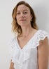 Introducing our delightful White V Neck Lace Vest. This elegant sleeveless top is detailed with ruffles at the shoulder that are intricated with embroidery, these touches adds timeless elegance to any outfit. Crafted with high-quality materials, this vest offers both comfort and durability. Its relaxed fit and versatile design make it a must-have for every woman's wardrobe. Add a touch of detail to your work attire by layering it under a blazer, paired with tailored trousers and closed-toe shoes.