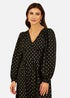 If you’re looking for a unique take on partywear this season, ditch the sequins and shine in this gold foil print instead. With a long sleeved design, v neck and added ruffle detail on the hemline, which splits on one side to the thigh. This black dress is understanded glamour at it's best, wear with gold jewellery to make a statement at your next event.
