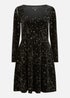 Capture the beauty of the night sky in this black long sleeve skater dress from Yumi. With a square neckline, fit flare shape and stunning velour fabric that is not only glamorous but super soft too. The all over constellation print is a unique take on sparkles for the festive season and would look great at your Christmas party styles with gold shoes and accessories.